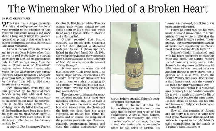 Little is known about the Winery and its owner, John Sciutto, other than he was in real estate prior to starting his winery in 1949. He emigrated from Italy in 1931 to “get away from the Fascist Government of Mussolini” reports writer Aubrey Graves, who wrote for the Washington Post during the 1950s. Graves, known as The Squire of Grigsby Hill, published five articles for the Post from 1953 to 1956 about the Sciutto and his winery. .